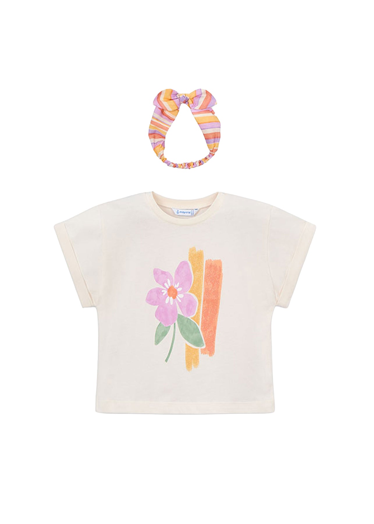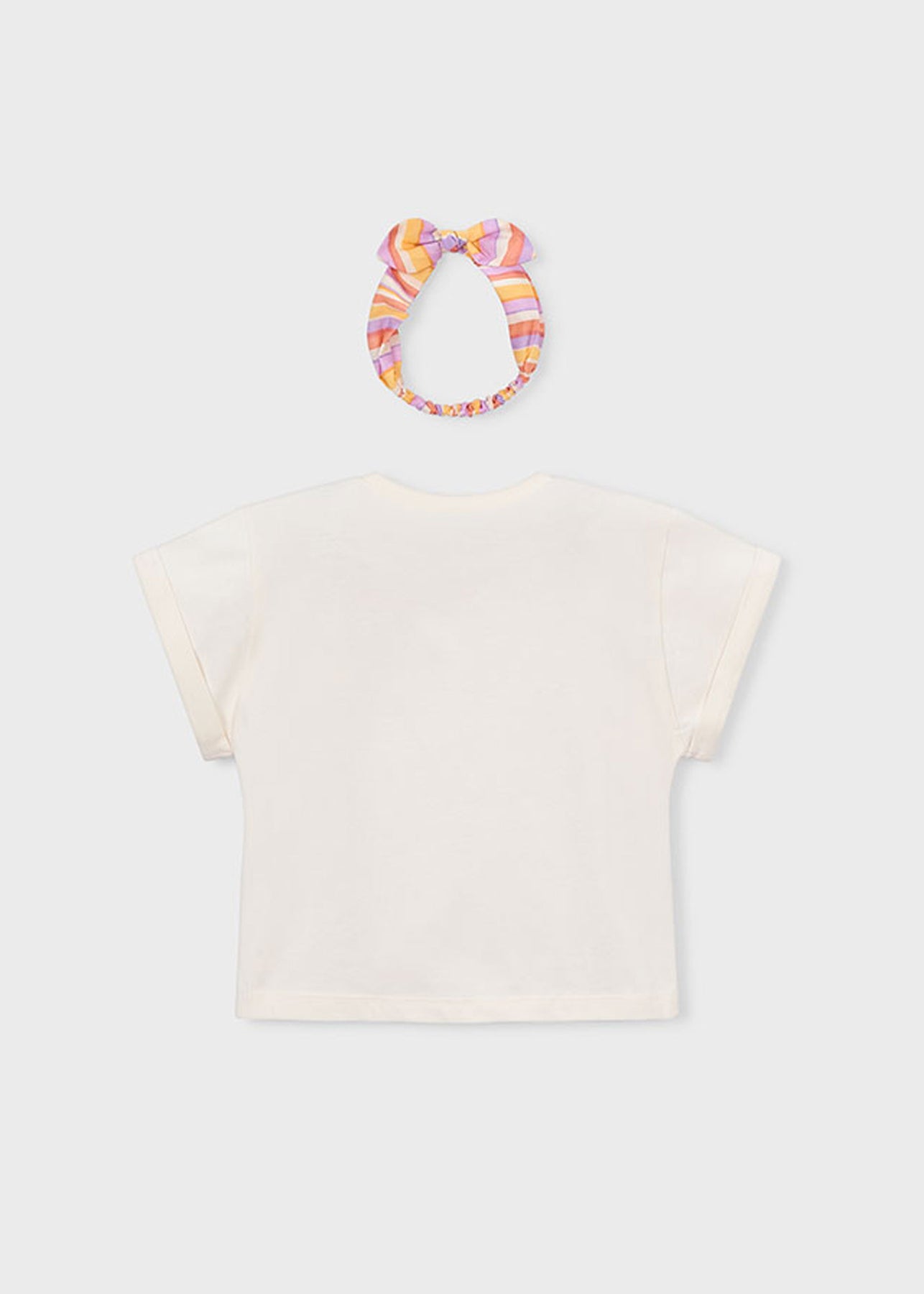 - Dettagli: girocollo, manica corta, stampa anteriore e fascia per capelli abbinata.