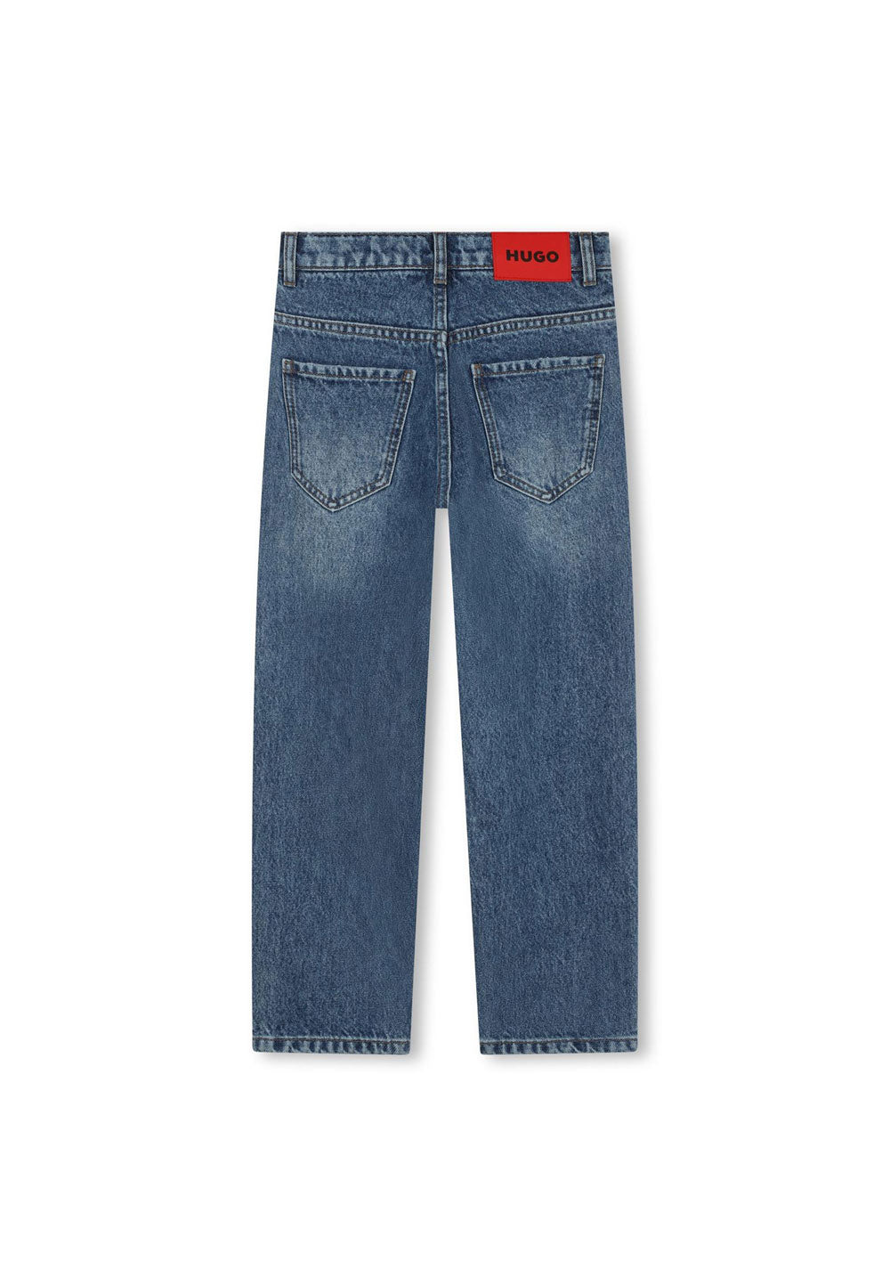 The HUGO boys' trousers are made from medium-wash blue denim, ideal for a casual and modern look. The loose fit design ensures comfort and freedom of movement, while the adjustable drawstring waist allows for a personalized fit. Made from stretch cotton, the trousers are durable and comfortable. Equipped with five pockets, they are practical and functional for storing small items. Perfect for any occasion, from free play to outings with the family.