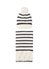 Il cappello, adornato da una vivace fantasia a righe, è impreziosito da un grazioso pon pon che aggiunge un tocco giocoso e alla moda. La sciarpa, abbinata, sfoggia lo stesso motivo a righe e un delicato ricamo che cattura l'attenzione con eleganza e originalità.