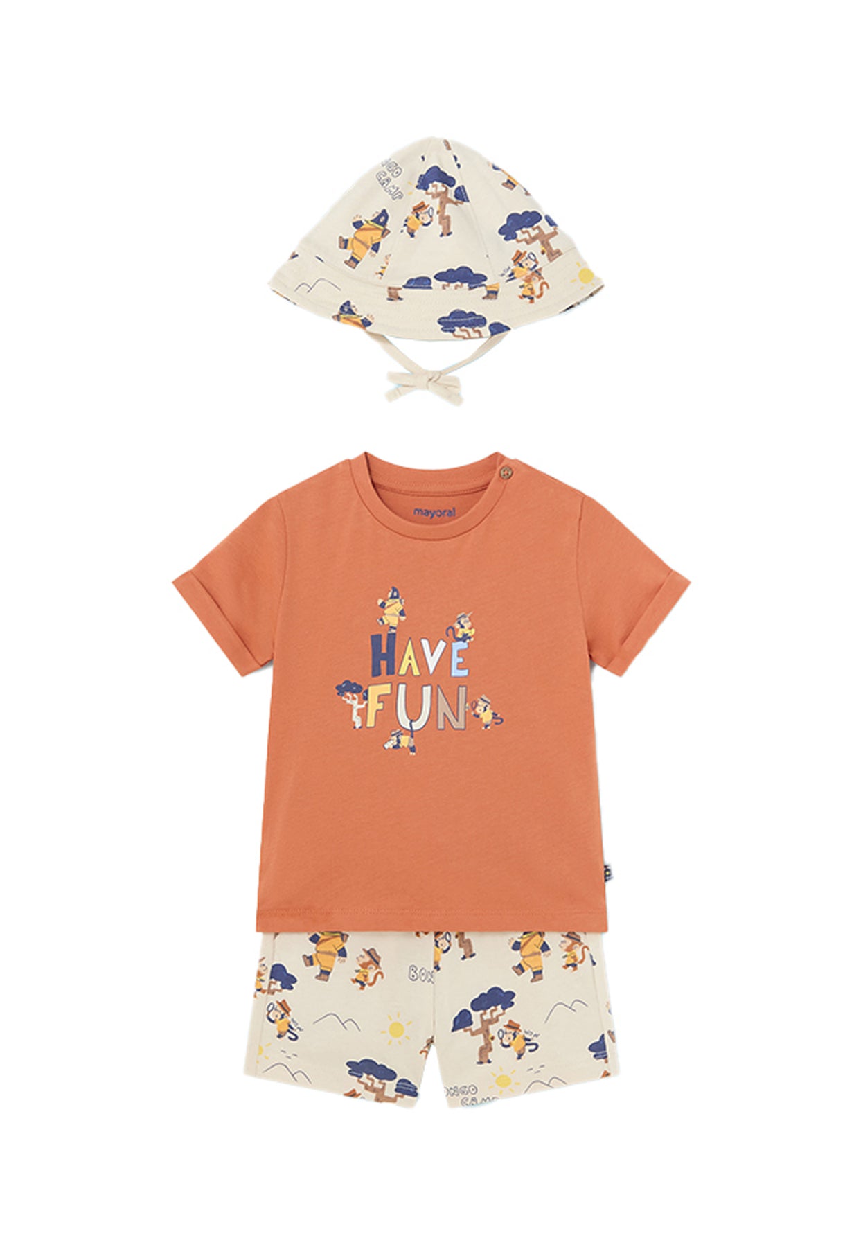 The MAYORAL boys' set consists of three pieces: a short-sleeved t-shirt printed with playful and colorful motifs, a matching printed Bermuda shorts and a hat with a drawstring to protect from the sun. Made of soft cotton, it is comfortable and light for your child's comfort during hot days. With a bright and modern design, this set is perfect for any summer occasion, from playing in the garden to walks by the sea. A high-quality garment that cannot be missing from your little one's wardrobe.